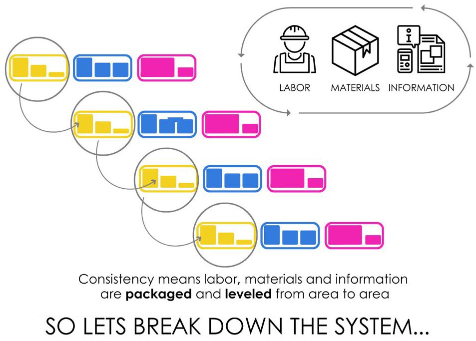 So, how do we get all our trades going at different speeds with differing levels of effort in their work to go the same speed and the same distance apart? Glad you asked: we package them into train cars. Imagine all our trades like individual vehicles that are going different speeds and as different sized units. (I’m imagining the movie mad max here.) how could you get them to flow? Load them onto train cars is the answer. Some cars would be loaded with multiple vehicles, and some cars would only load with a part of a larger vehicle, but it would all be leveled and coupled together just like a car manufacturing assembly line. Then, we would run that train – going the same speed the same distance apart – through the project in a production line from zone to zone.