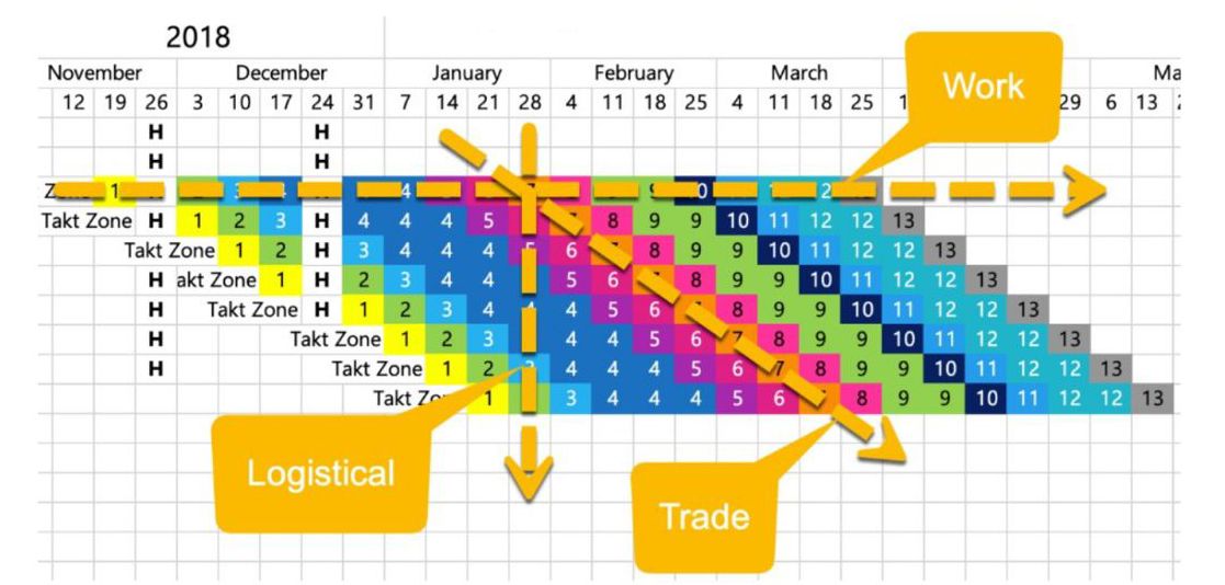 Why is this so important? Because the process, meaning the workers, tools, Equipment, and materials – the trade as a whole working the same speed With other trades is the flow unit in construction. It is the thing that Should be flowing. Just like in a car manufacturing plant, the car is the Flow unit, and in a hospital, the patient is the flow unit. In construction, the Trades or the processes is the flow unit. So, we can never flow without Having trades flowing. We can never have trades flowing without Organizing them into a production line as a train and that means we Should only ever see a master schedule that accommodates this concept. This is where takt becomes our base. Only a schedule with time shown Across the top, zones shown along the side, and takt wagons (or box Cars), which represent the ‘process’ shown in the middle – and all going From area to area at the same speed and the same distance apart – can Become our master schedule.